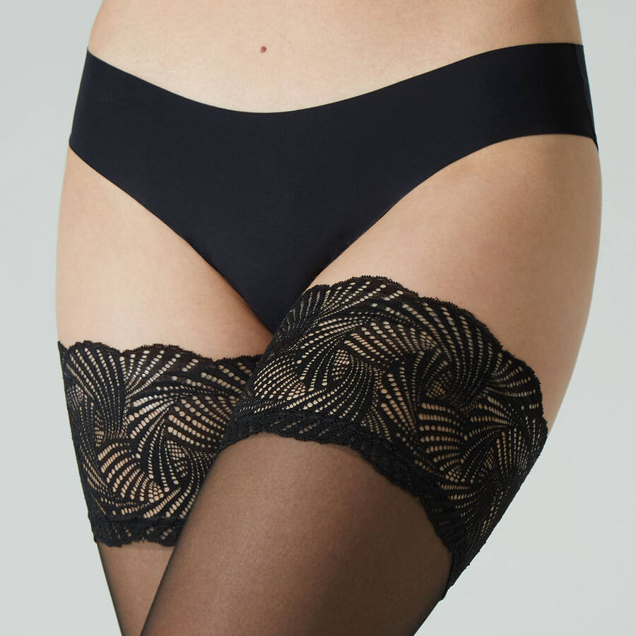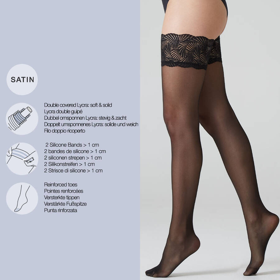 20 denier hold-up stockings, available up to size 4XL. Perfect to wear during work days or leisure time. Two silicone strips inside the band guarantee an excellent grip on the thighs and keep the stockings in place. Thanks to the double covered yarn,the knitting is resistant, refined, soft and uniform. Reinforced toes. Try these thigh-highs with an elegant dress and a pair of high heels for an elegant and sensual look!